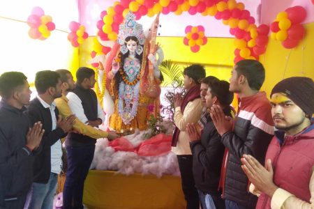 धूमधाम से की जा रही है मां शारदे की पूजा, पुलिस चौकस